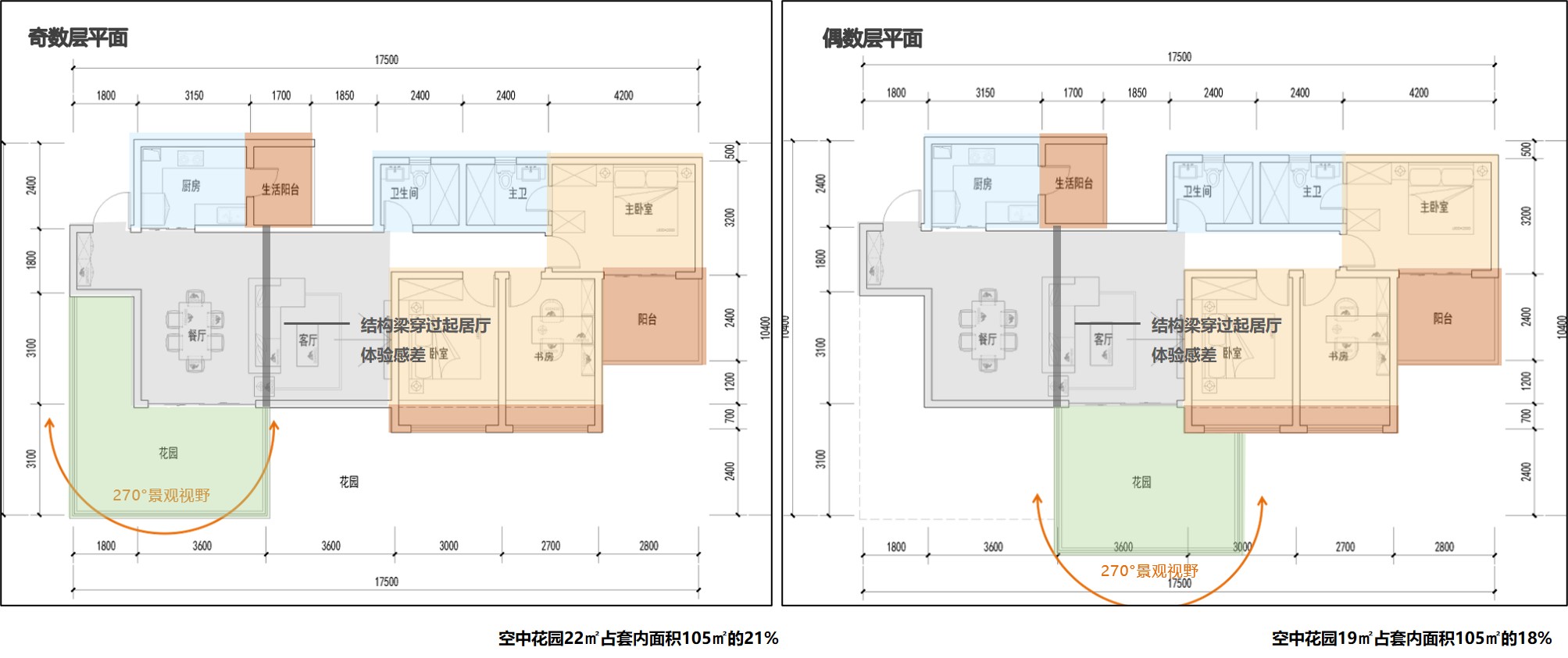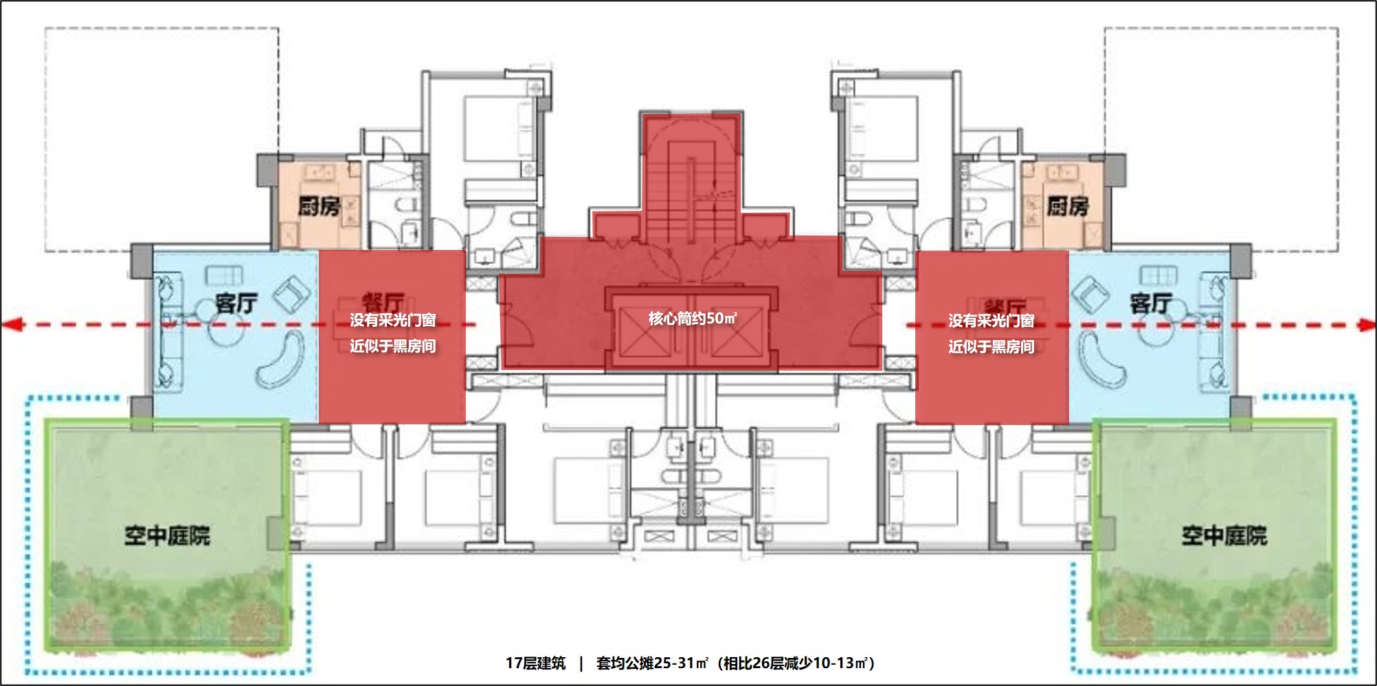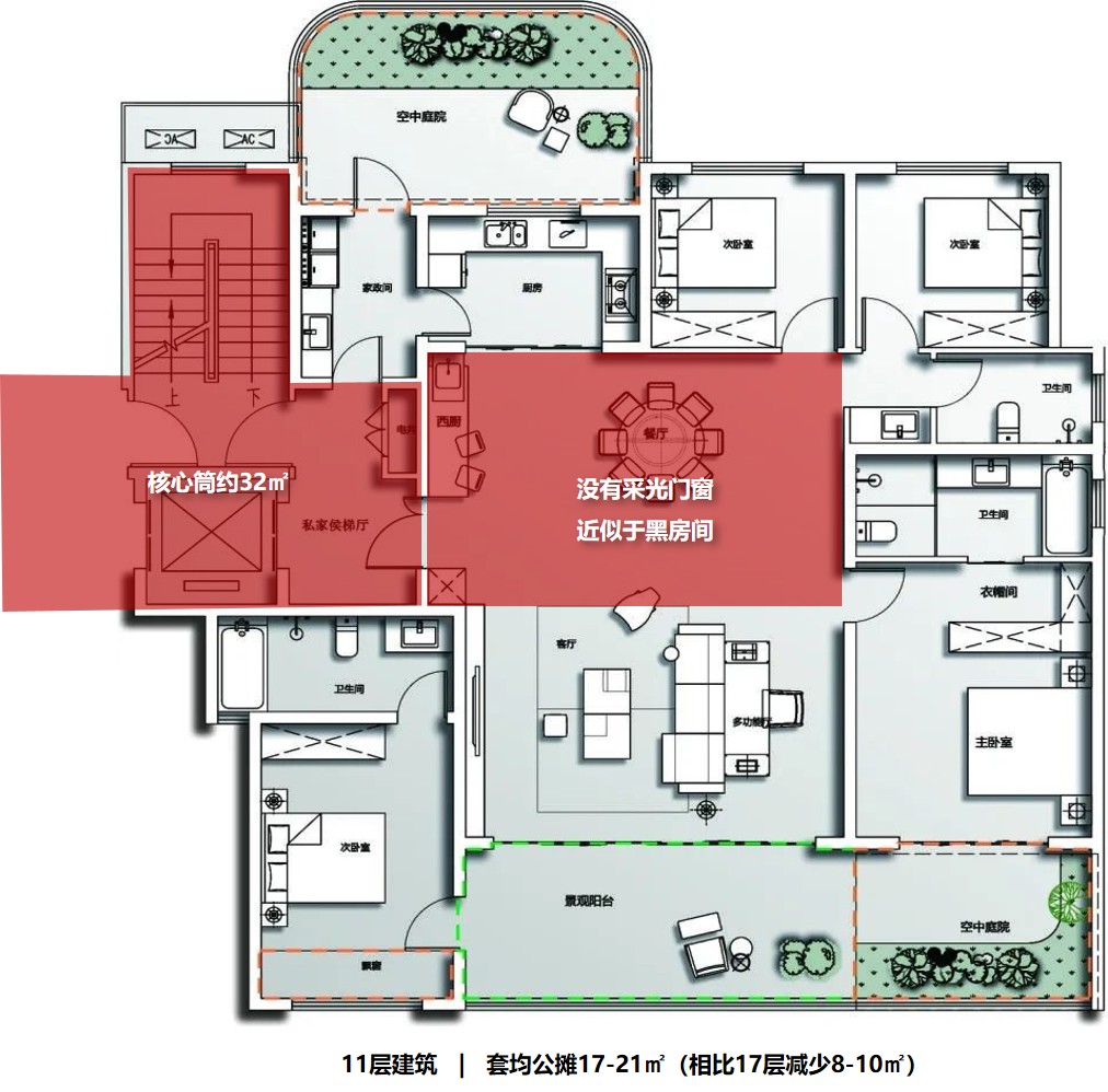 以17F一层两户为例,标准层建筑面积240㎡、公摊面积60㎡,户均套内面积90㎡,两个自然层高度的空中花园水平投影面积13.5-22.5㎡、绿化60%即8.1-13.5㎡、铺装40%即5.4-9㎡,传统住宅一个自然层高度的宽厅阳台铺装13-17㎡。绿化60%是地方政府普遍性要求,体现生态特征。前述空中花园相比传统阳台,在水平投影面积上相差无几、优势微弱,在铺装面积上大幅减少、劣势明显,在产权上不计容、优势明显。虽然满足了锦上添花的生态需求,但没有满足最基本的休闲需求,人居品质有升有降、总体偏低,没有构建产品差异化的核心竞争力。为了扩大休闲空间,住户大概率的会铲除建设单位种植的植物,造成巨大浪费,同时建筑立面垂直绿化效果大幅下降,空中花园后期成为了传统阳台的放大挑高版本,违背了建设空中花园的初衷。