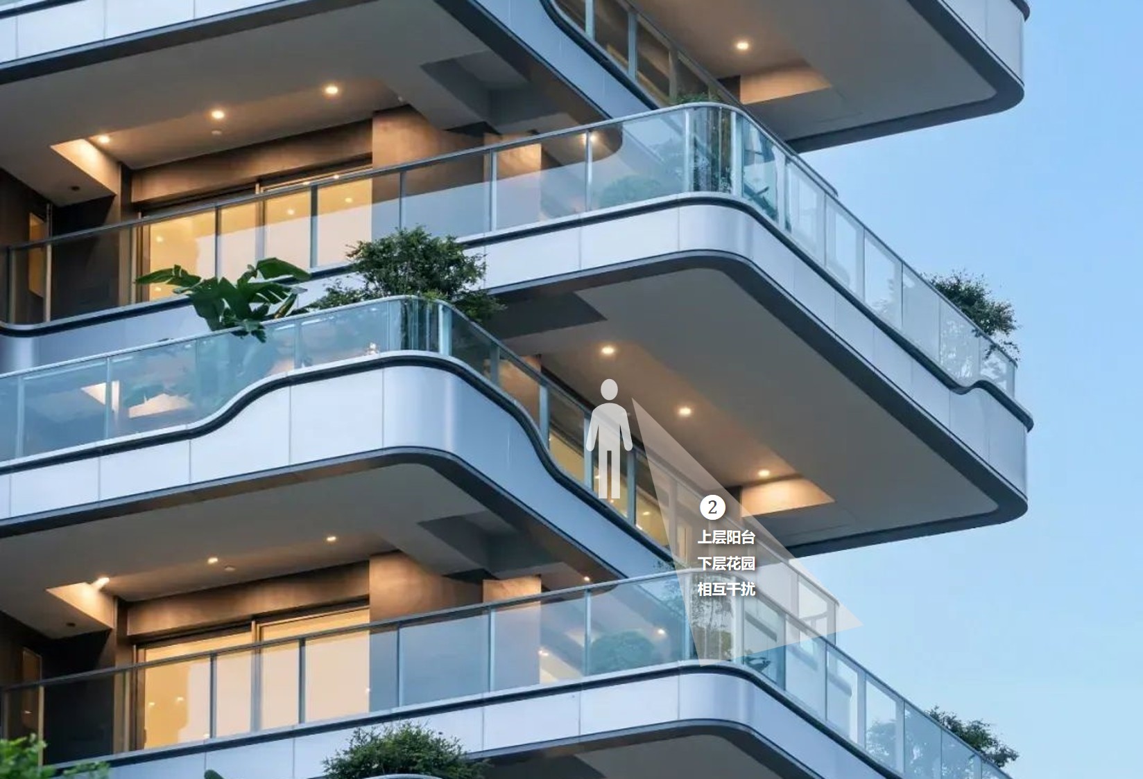 空中花园悬挑进深普遍在3m以上,在外端可转角对视下层套型的卧室,类似于在空中花园内对视本套型的卧室,让下层住户感到无所适从。