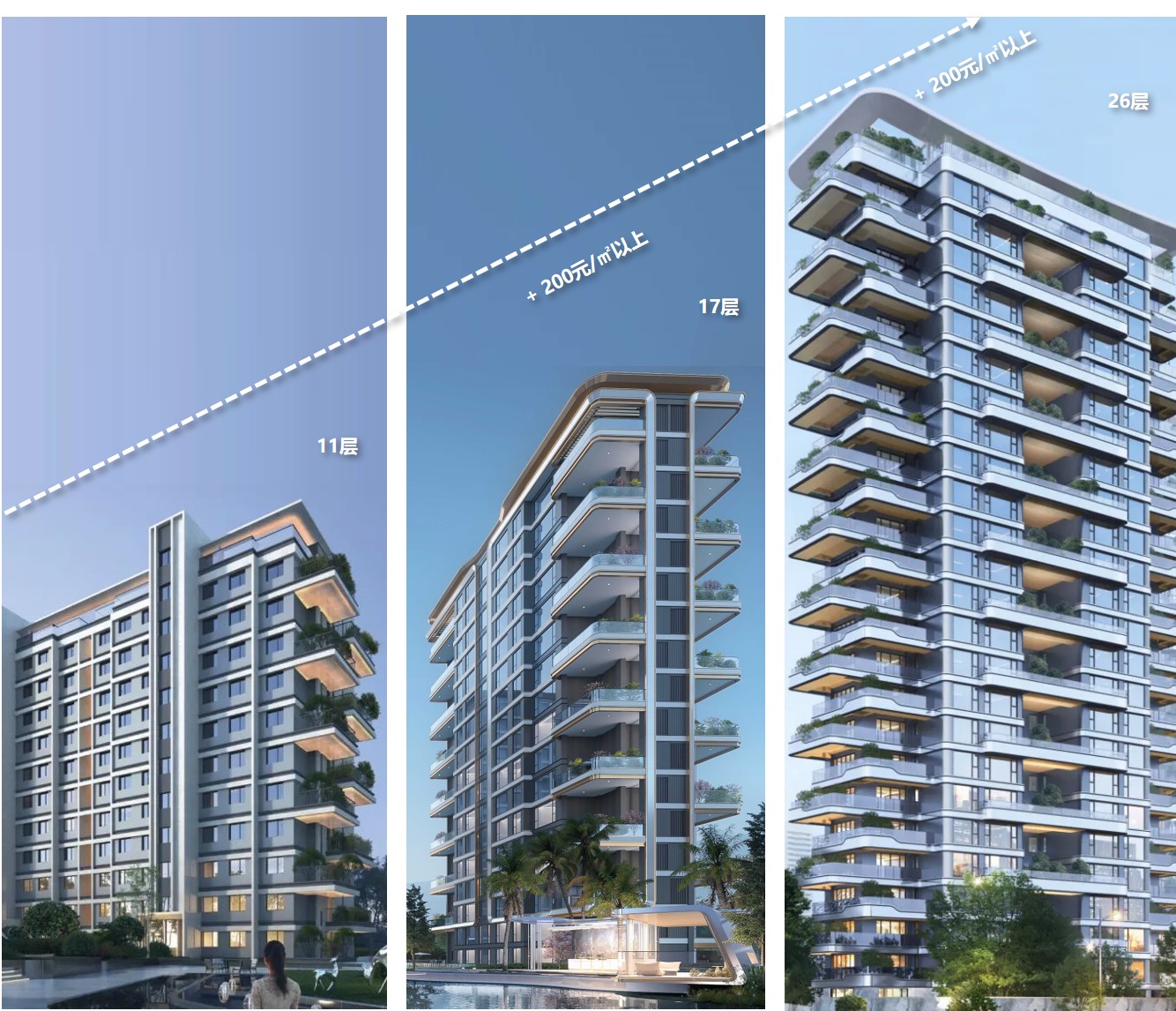 以容积率2.0为例,传统住宅建筑高度以11层为主,当前城市花园住宅建筑高度以26层为主、部分17层。以计容建面为基数对比建安成本,17层建筑比11层建筑增加200元/㎡以上,26层建筑比17层建筑增加200元/㎡以上。