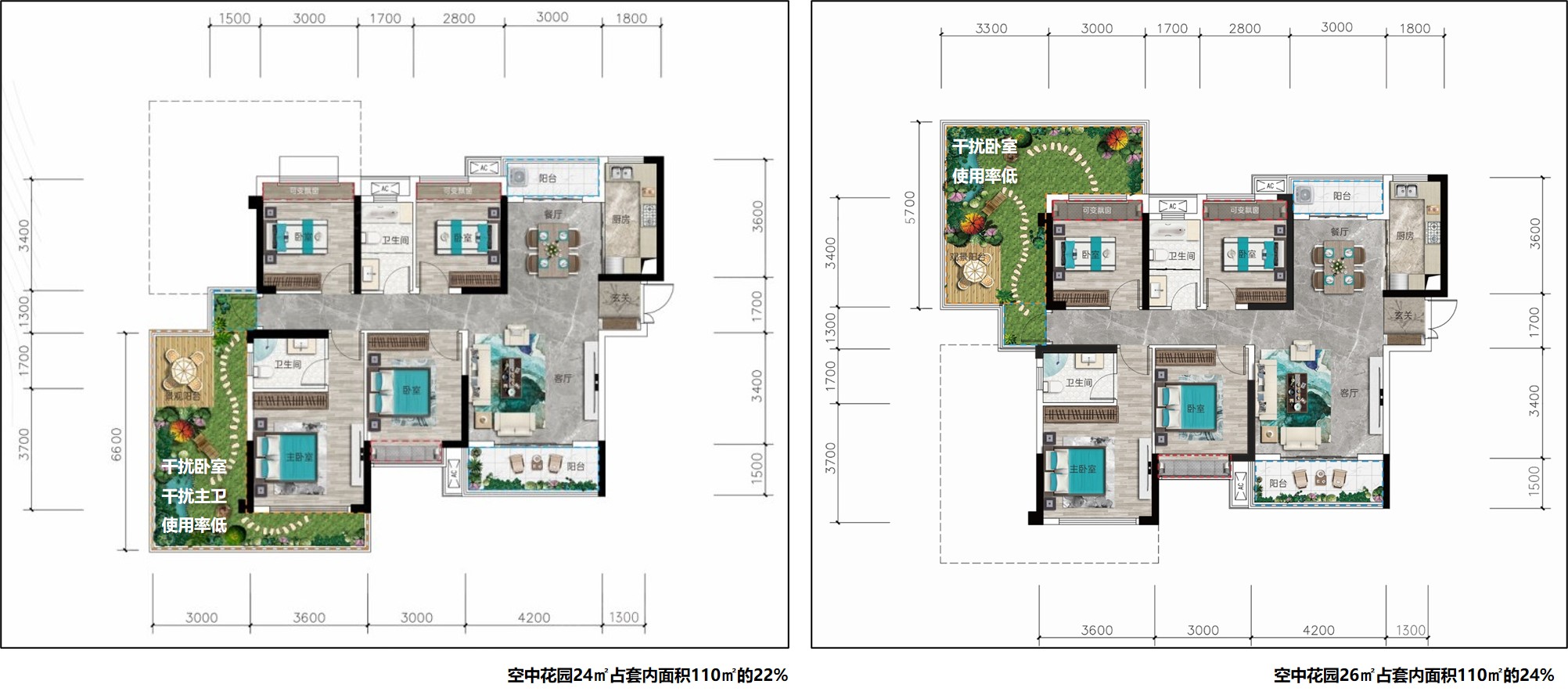 以17F一层两户为例,标准层建筑面积240㎡、公摊面积60㎡,户均套内面积90㎡,两个自然层高度的空中花园水平投影面积13.5-22.5㎡、绿化60%即8.1-13.5㎡、铺装40%即5.4-9㎡,传统住宅一个自然层高度的宽厅阳台铺装13-17㎡。绿化60%是地方政府普遍性要求,体现生态特征。前述空中花园相比传统阳台,在水平投影面积上相差无几、优势微弱,在铺装面积上大幅减少、劣势明显,在产权上不计容、优势明显。虽然满足了锦上添花的生态需求,但没有满足最基本的休闲需求,人居品质有升有降、总体偏低,没有构建产品差异化的核心竞争力。为了扩大休闲空间,住户大概率的会铲除建设单位种植的植物,造成巨大浪费,同时建筑立面垂直绿化效果大幅下降,空中花园后期成为了传统阳台的放大挑高版本,违背了建设空中花园的初衷。