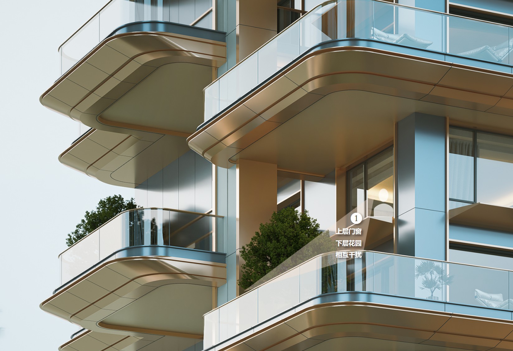 1、空中花园上层外墙面设置门窗、阳台
