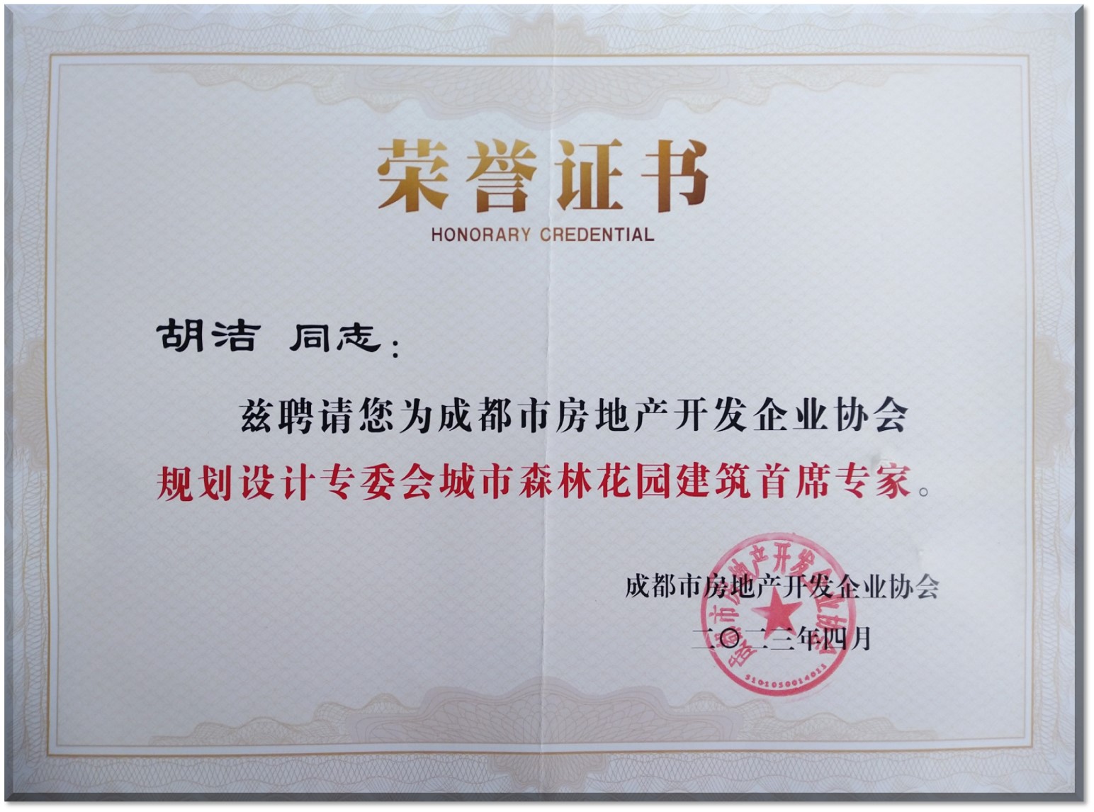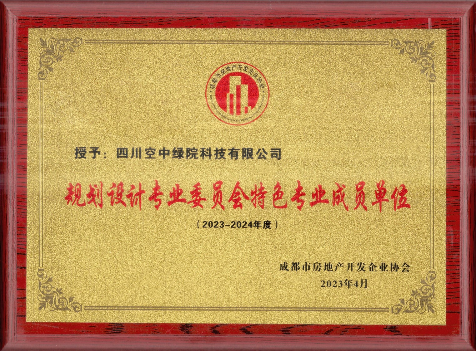 2023年4月17日成都市房地产开发企业协会授予四川空中绿院科技有限公司为规划设计专业委员会特色专业成员单位,聘请该单位胡洁为规划设计专委会城市森林花园建筑首席专家。